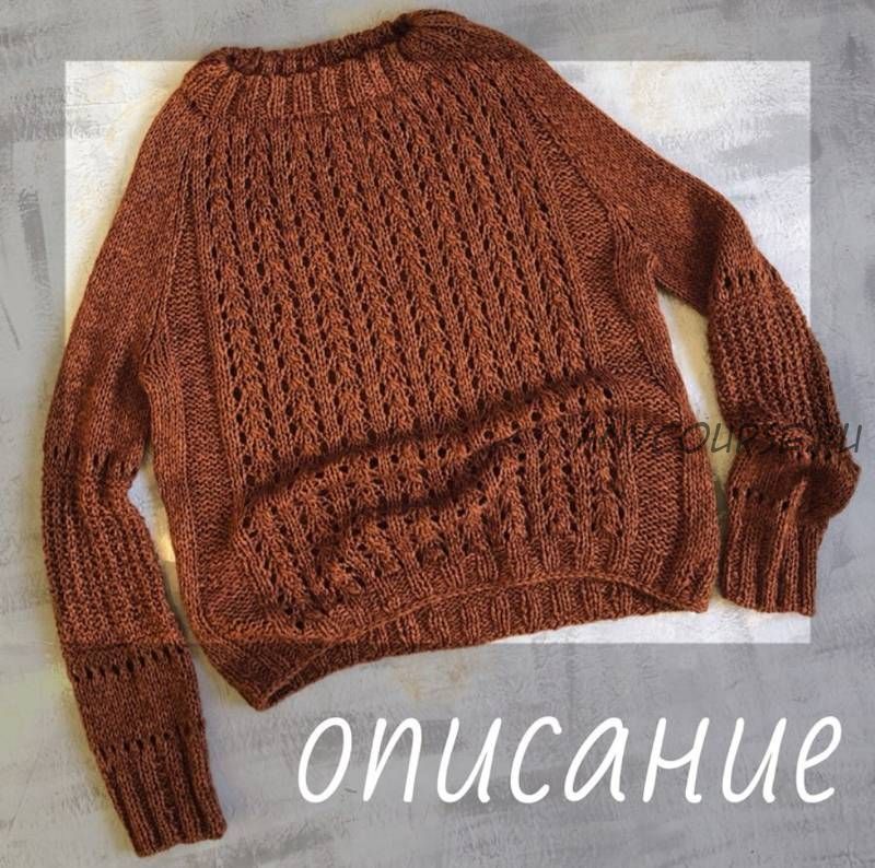 Свитер вяжется снизу вверх по кругу до пройм. Далее набираем петли для рукава бросовой нитью и вяжем кокетку от пройм вверх, выполняем горловину. Рукава вяжутся вниз от пройм и закрываются иглой.
