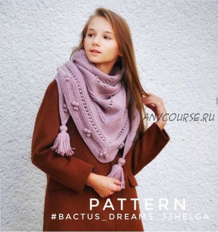 - описание (формат PDF), содержит основные положения вязания треугольного платка, набор основных узоров и элементов, используемых в бактусах, показаны различные способы оформления края изделия и способы добавления петель