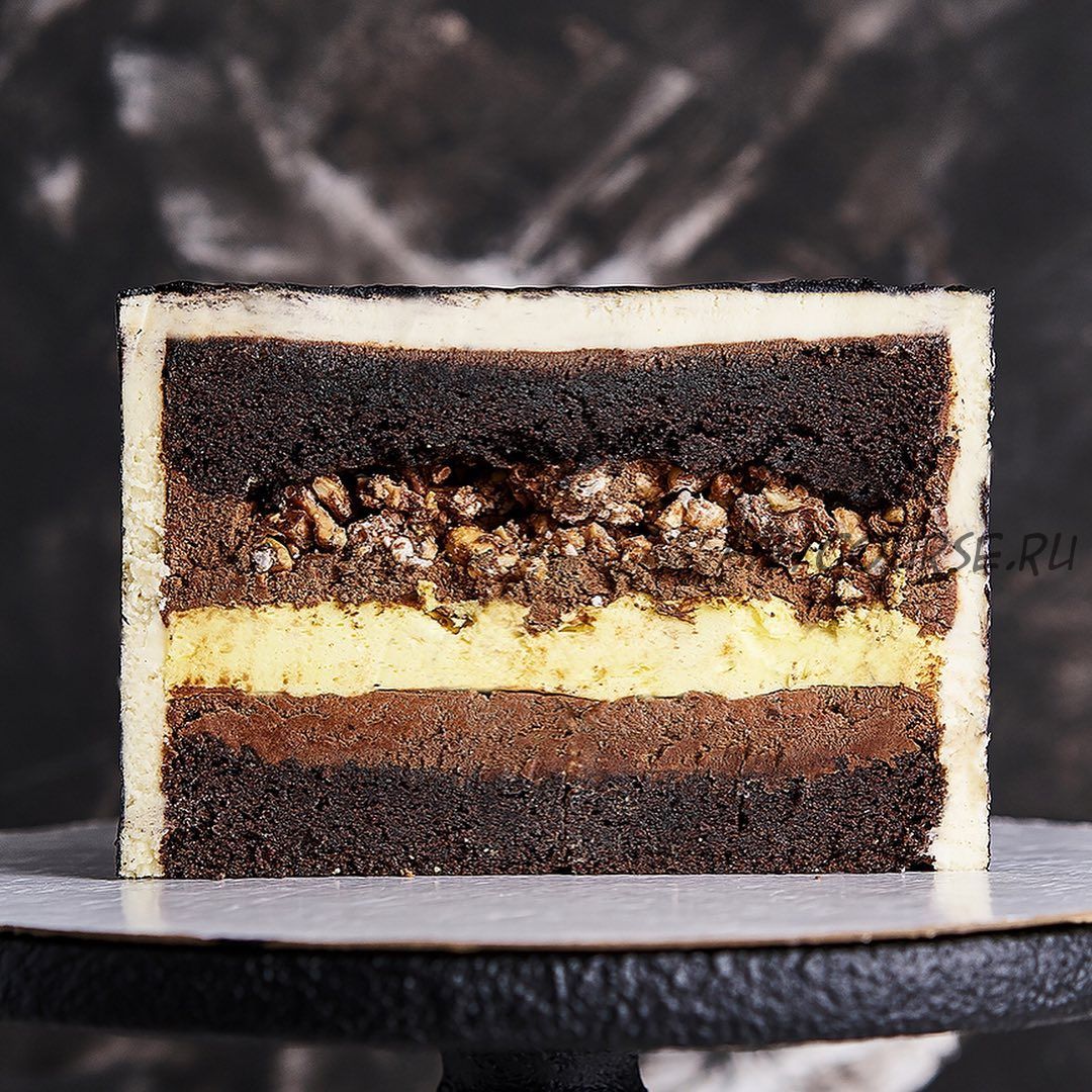 Мега Шоколадный бисквит, банановый мусс, хрустящее фундучно-миндальное пралине, шоколадный ганаш.
