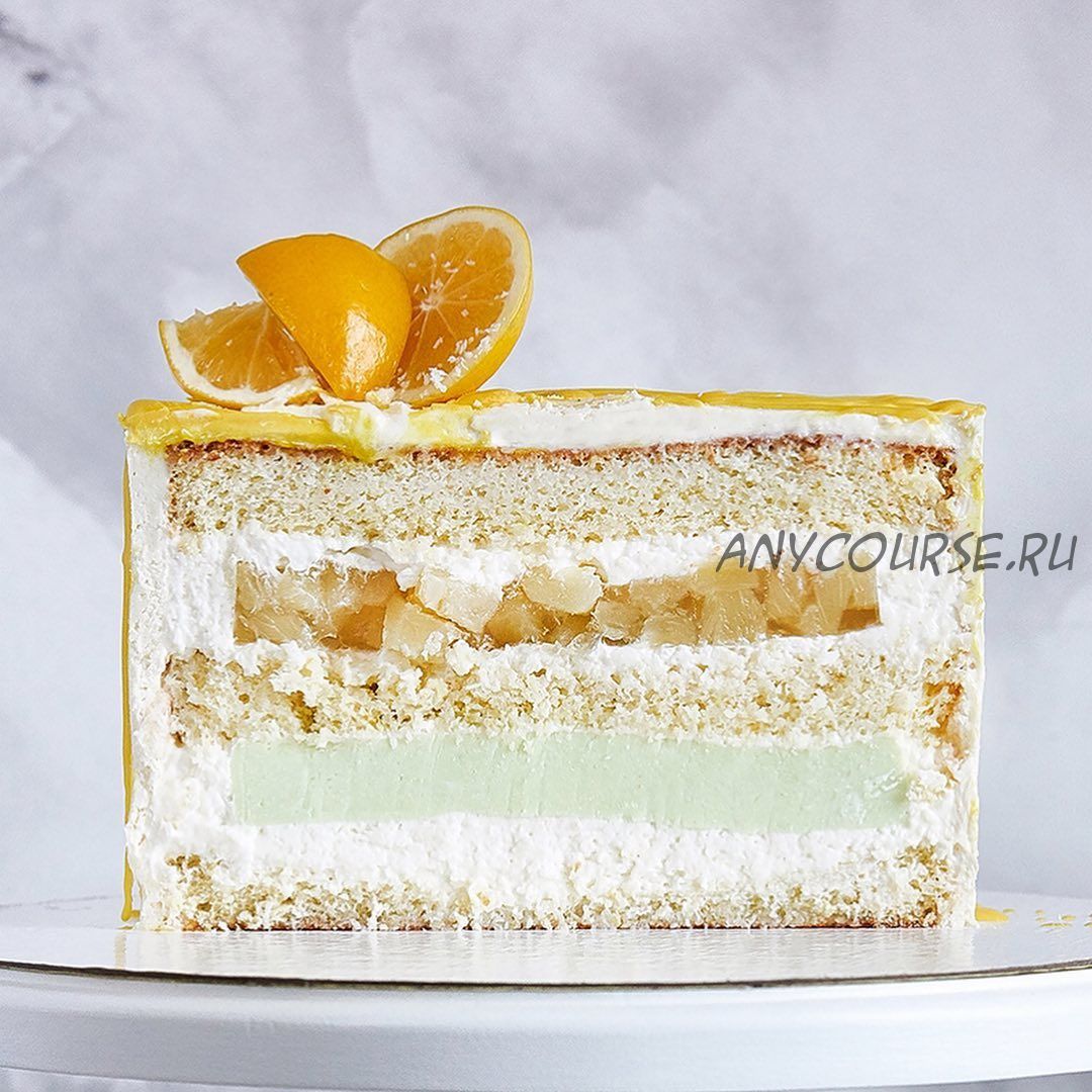 Кокосовый бисквит, ананасовое компоте, лимонное кремю, кокосовый крем.