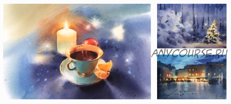 В акварельном марафоне «24 часа. Ночь» Вы напишете четыре картины — городские и природные пейзажи и новогодний натюрморт. Научитесь передавать в акварели освещение в полной темноте, создадите атмосферу праздника и волшебства. Хотите больше? Получите обратную связь от Сергея Курбатова на вебинаре и сделайте ваши работы еще лучше! Зимние вечера — самое время рисовать!