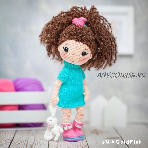 Размер куклы 21 см. Связана из Yarnart Jeans, полностью на каркасе, голова поворотная. Волосы - буклированная пряжа. В МК входит описание самой куклы, всей одежды, а так же зайки. Куколка и зайка связаны крючком, одежда спицами. Уровень сложности средний.