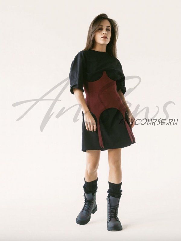 ? Корсаж под грудь, с отрезной линией талии и баской. Корсаж выполнен на подкладке, застегивается на молнию в среднем шве спинки. Баска с рельефными швами, имеет фигурную линию низа, имитирующую подвязки с репсовыми лентами.
