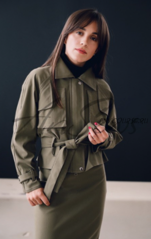 ? Укороченная куртка прямого кроя без подкладки в стиле «Милитари», с накладными карманами с клапанами. Рукава покроя реглан со шлевками внизу и ремешками. Воротник отложной, застежка на молнию и кнопки на планке. По линии талии – пояс со шлевками.