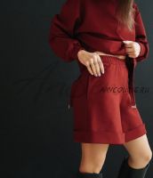 ? Немного расклешенные шорты из джерси длиной до середины бедра. В боковых швах расположены карманы. Пояс шорт находится на естественной линии талии. Пояс цельнокроеный, с декоративной отстрочкой, на резинке. По низу шорт – широкие отвороты. Прибавки к обхвату бедер нет. Комфорт достигается за счет растяжимости