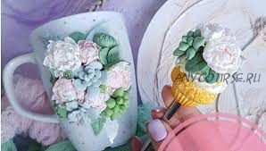 ? Кружка с нежнейшей композицией из нескольких видов листьев, суккулентов с пионами.