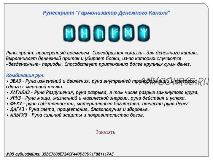 В каждую сессию включено дополнение: инициация, открывающая для практика поток рунической энергии. Рунескрипт действует в течение 7 дней, после чего необходимо повторно прослушать аудиосессию.