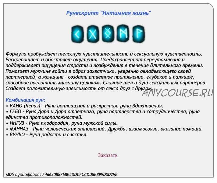 В каждую сессию включено дополнение: инициация, открывающая для практика поток рунической энергии. Рунескрипт действует в течение 7 дней, после чего необходимо повторно прослушать аудиосессию.