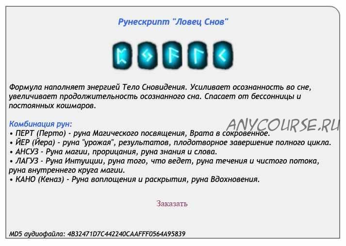В каждую сессию включено дополнение: инициация, открывающая для практика поток рунической энергии. Рунескрипт действует в течение 7 дней, после чего необходимо повторно прослушать аудиосессию.