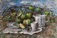 ? Зеленые яблочки всегда создают уютную атмосферу в любом натюрморте. Общую композицию дополняют фарфоровые чайник и чашка, серебряная ложка и стеклянная чаша. Не обошлось без хлопковой драпировки и брейгелевского пейзажа.
