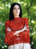 ? Очень ажурная, вся в кружевах блуза дополнена воротником стойкой, образующим сзади вырез-капельку.