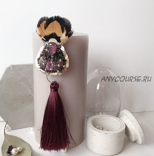 Курс 'Чертополох' основан на работе с перьями и декоративным шнуром. Также в курсе я расскажу как создавать объемы, вышивать пайетками и использовать кристаллы Swarovski.