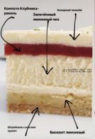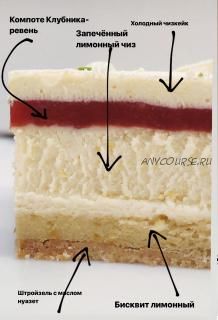 Лимонный бисквит, реконструированное песочное тесто, лимонный запечённый чизкейк, Кули клубника ревень, мусс крем чиз