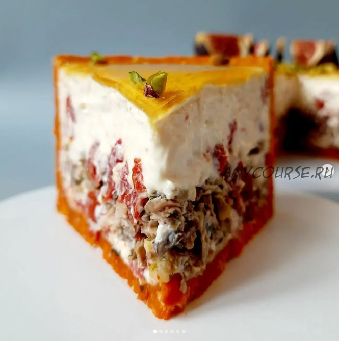 Чизкейк закусочный 'Мадейро' сабле с кунжутом, сырный слой с вялеными томатами, паштет домашнего приготовления с фисташками и все это блаженство окутано пьянящим винным желе