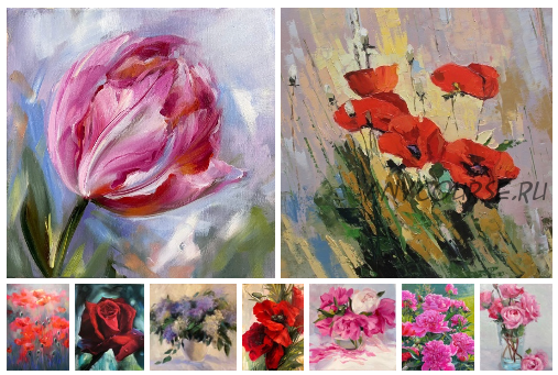 Мы решили собрать все наши цветочные уроки в один большой сборник для Вашего удобства. К каждому уроку добавлен референс и итоговый вариант картины, а также перечень необходимых для работы инструментов.