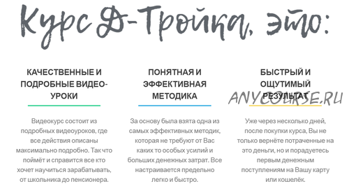 Курс Д-Тройка, это надёжная поддержка по всем вопросам, по почте и по телефону. Это гарантия результата и выхода на высокие доходы.
