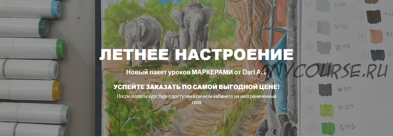 Для рисования по урокам 'Летнее настроение' вам потребуется скетчбук, 18 оттенков маркеров и несколько оттенков цветных карандашей