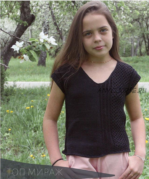Топ вяжется однои? деталью снизу вверх до прои?м, затем отдельными деталями спинка и перед.