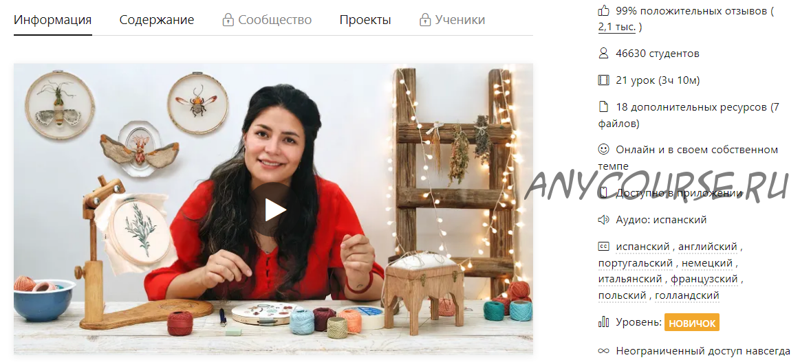 В то время как в курсе «Экспериментальные техники вышивки на бумаге» она предлагала вам изучить новые средства, этот курс научит вас техникам живописной вышивки с использованием иглы и нити для создания реалистичного изображения. Играя с цветом и объемом и используя инструменты, которые может предложить вышивка, научитесь рисовать нитками с нуля.