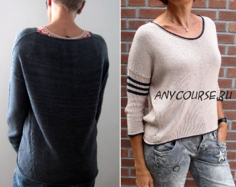 ? Затем перед и спинка соединяются в круг и вяжутся вкруговую, нижняя часть формируется укороченными рядами. Линии отверстий по обе стороны от проймы добавляют интерес и придают легкую коническую форму тела. Петли рукава поднимаются вдоль проймы для вязания рукава вкруговую сверху вниз до манжеты.