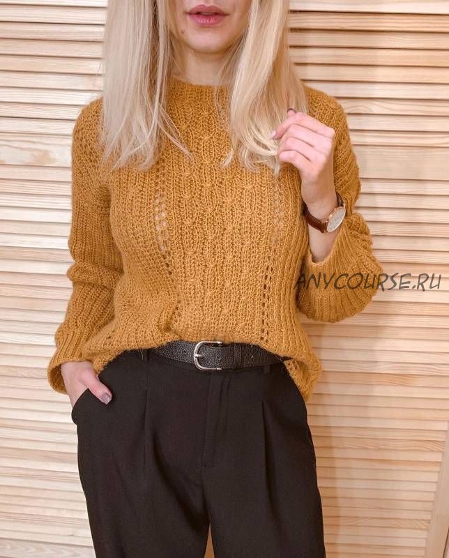 Изделие вяжется поперек. Состоит из отдельных деталей: передняя полочка, задняя полочка и рукава. Спинка с ростком, немного удлиненная. Рукав прямой, с удлиненными манжетами. Спущенное плечо. Джемпер сшивной. ??