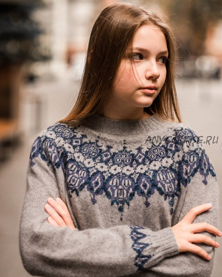 Жаккардовая кокетка, укороченные ряды, формирующие росток, орнамент по краю изделия. Всего 25 размеров в описании - от детского на 12 месяцев до взрослого ОГ 158 см.