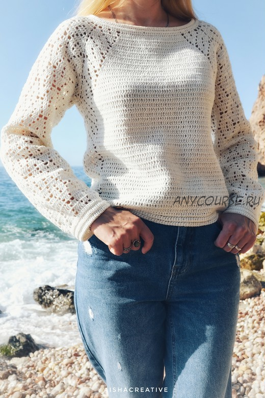 Модель джемпера реглан от горловины, ажурный рукав, необходим навык вязания крючком по схеме.