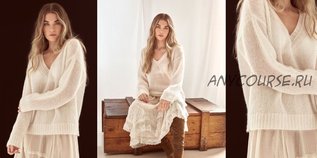 Женский джемпер из новой коллекции Divine от английского дизайнера Ким Харгривз, вязаный из мохера, смотрится невероятно стильно благодаря свободному фасону оверсайз, V вырезу горловины и нежности самого мохера, поскольку полотно из него очень выигрывает на фоне остального трикотажа.