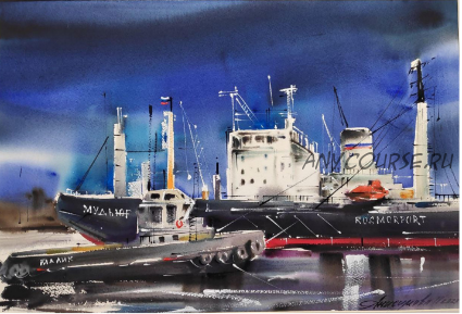 - Опираясь на референс и руководствуясь советами художника рисуем морской индустриальный пейзаж, наполненный небом, водой и сложными формами судов.