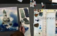 Облака, волны, отражение в воде и как сопоставление этому движимому - монолит камней и маяка. Такую композицию вы сможете изобразить вместе с художником Анной Чепурной . Работа ведется по сырой бумаге акварелью, с последующей детализацией по подсыхающей поверхности. В картине используются почти монохромные цвета.