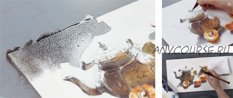 В этом видеоуроке Анна Иванова собрала композицию из таких разных предметов - медный чайник, сочные фрукты, декоративные уточки - залила их солнечным светом и сотворила волшебный натюрморт. Вместе с мастером вы пройдете от карандашного рисунка к акварельной работе, нарисуете все в технике 'а ла прима' и поймете, как заставить картину сиять!