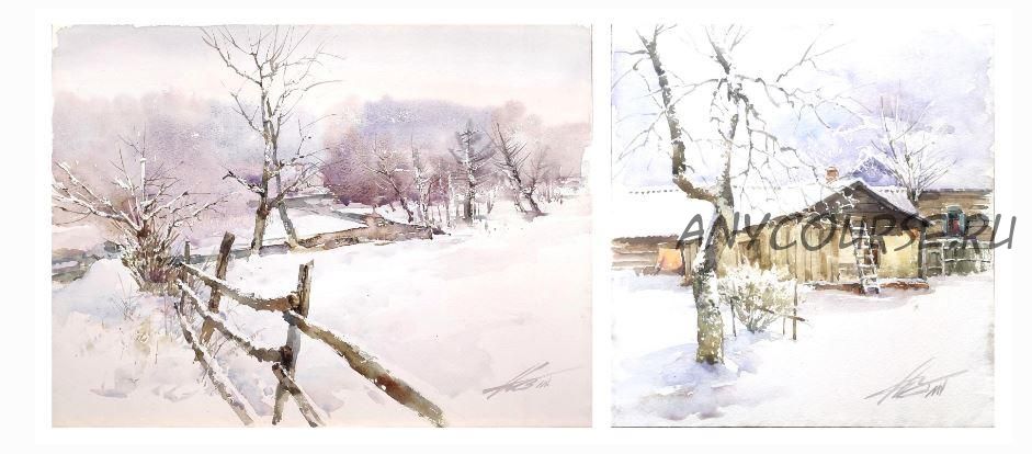 Цель: Опираясь на референс и карандашный набросок, пишем вместе с художником зимний пейзаж. Следуя за направлениями изгороди и ручья, уводим зрителя в глубь листа, в какую-то тайну, создавая этим движением интригу. ВАЖНО! Работа ведется по готовому карандашному наброску, подготовьте его заранее из домашнего задания. Продолжительность урока 1 час 32 минуты.