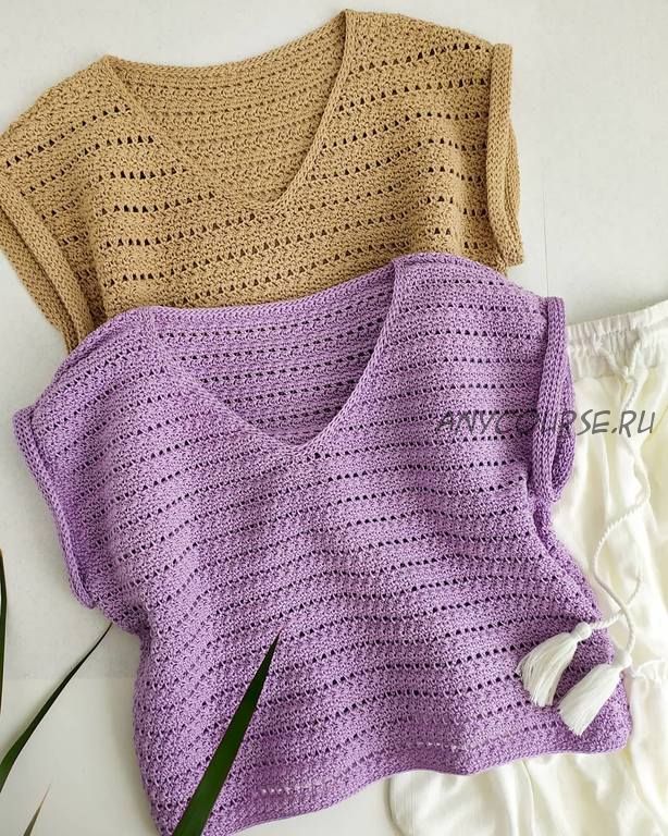 Эта футболка связана из пряжи Камтекс хлопок, цвет сирень (058), также подойдет пряжа Nako Fiore (вязала из неё первый вариант футболки выше), а также любая другая 100г/300-400м.