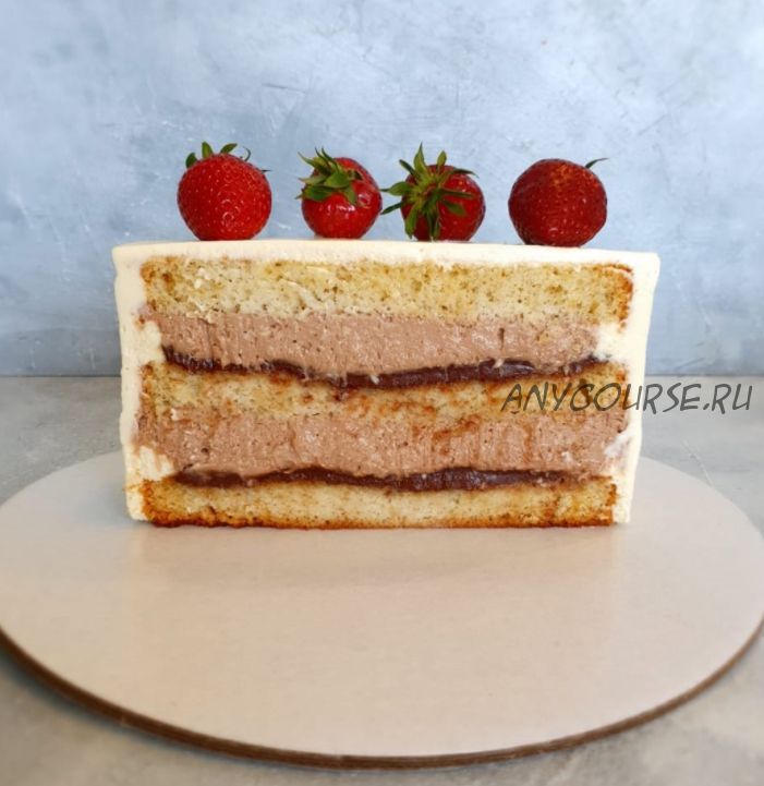 Вы увидите технику нарезки бисквита на коржи ножом, порядок сборки всех частей торта.