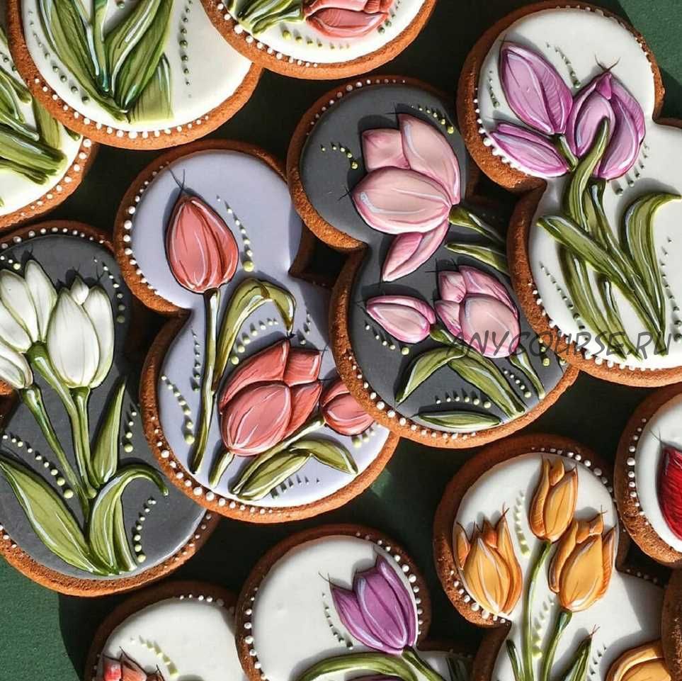 Нежные прянички с изображением весенних цветов смотрятся выигрышно за счёт эффектных приёмов, применяемых мастерами.