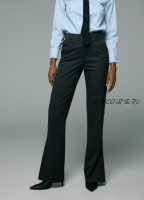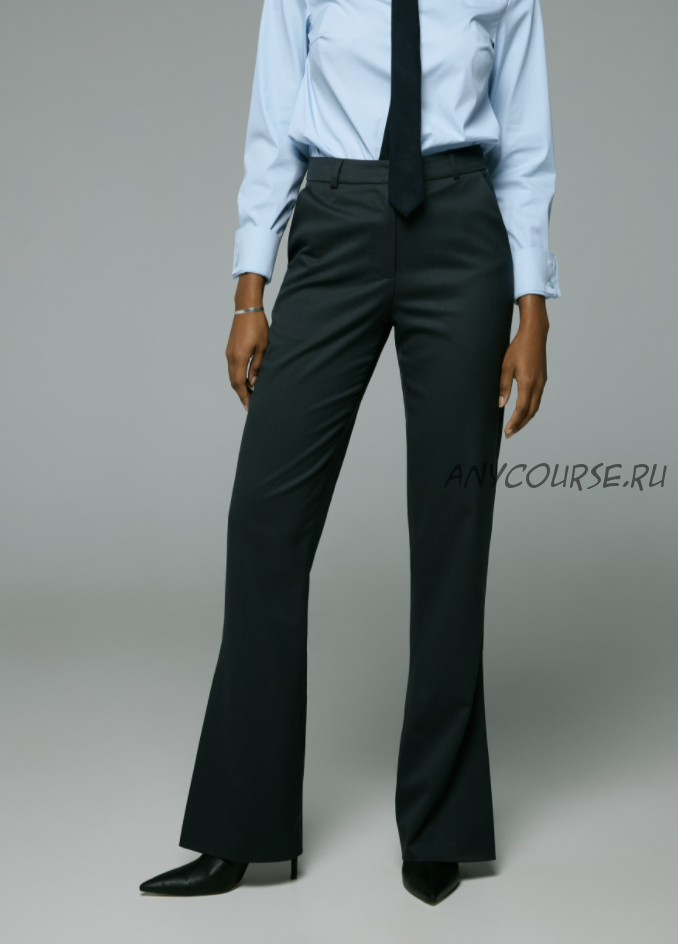 Брюки женские малого объема, прямые, удлиненные с разрезами в боковых швах. На задних половинках две пары вытачек. На передних половинках карманы в боковом шве с отрезной боковой частью и наклонной линией входа. Пояс подкройной. Застежка брюк на молнию в шве соединения передних частей, на одну петлю и пуговицу на поясе. Линия талии занижена на 4 см.
