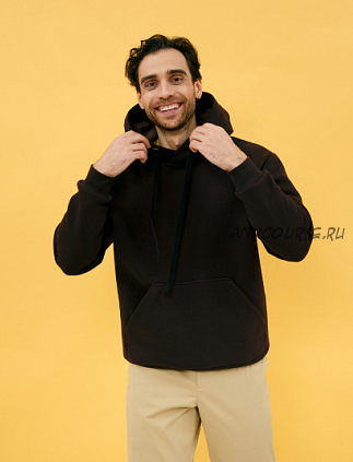 Выкройка мужского худи. Худи прямого силуэта. На переде по центру большой карман-кенгуру. Спинка без среднего шва. Линия плеча спущена, рукав на притачной манжете. Капюшон имеет центральный шов, по краю оформлен цельнокроеной обтачкой-кулисой с декоративной лентой, продетой в люверсы. Низ обработан поясом.