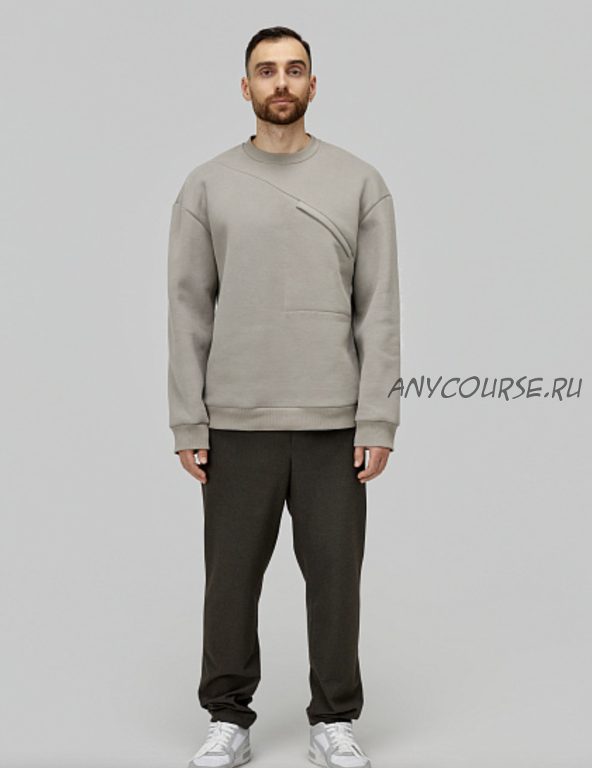 ? Свитшот мужской прямого силуэта, свободного объема, длиной до линии бедер. Перед с асимметричной кокеткой. В шве кокетки с левой стороны расположен карман с листочкой с настрочными концами и застежкой на молнию. Рукав рубашечный, плечо спущено на 8 см, низ рукава обработан притачной манжетой. Горловина округлой формы, обработана обтачкой. Низ изделия обработан притачным поясом.