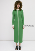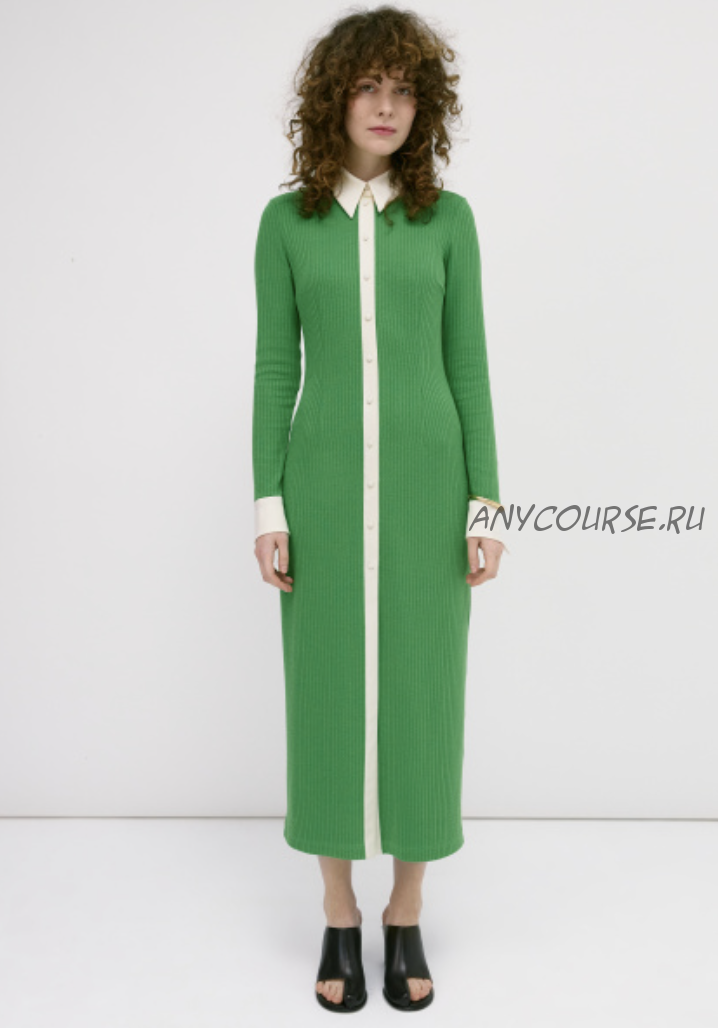 ? Платье малого объёма, прилегающего силуэта, длиной ниже середины икры. Перед с нагрудными вытачками из бокового шва и талиевыми вытачками. Спинка с талиевыми вытачками. Застежка центральная с отрезными планками на 10 обметанных петель и 10 пуговиц. Рукав втачной, одношовный, рубашечного типа. Нижний срез рукава обработан притачной манжетой. Манжета имеет фигурную форму, высота манжеты на концах больше, чем по центру. Разрез рукава оформлен планкой. Застежка манжеты на 1 обметанную петлю и 1 пуговицу. Воротник стояче отложной с отрезной стойкой с застежкой на 1 обметанную петлю и 1 пуговицу.