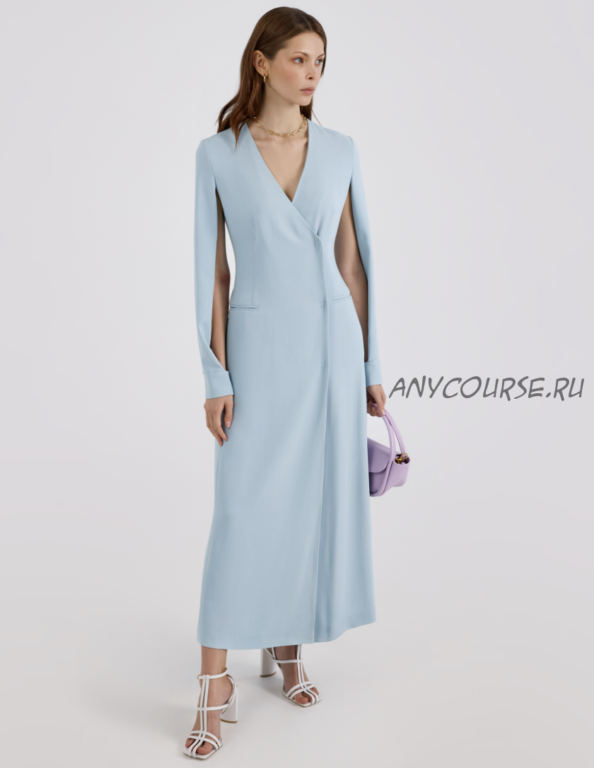? Платье малого объёма, полуприлегающего силуэта, расширенное к низу, длиной выше щиколотки. Застежка смещенная бортовая, на три пришивные кнопки. Боковой шов отсутствует, смоделирован бочок. На переде вытачка, образована за счет объединения нагрудной вытачки с талиевой, заканчивается подрезом по линии входа в карман. Карман прорезной с обтачками. Спинка со средним швом, талиевой и плечевой вытачками. Вырез горловины переда имеет V-образную форму. Рукав втачной, двухшовный, с нижним швом и швом по локтевому перекату. Рукав не притачан по нижней части проймы, что позволяет носить платье по принципу жилетки. Нижний срез рукава обработан притачной манжетой. Объем манжеты меньше объема рукава по нижнему срезу. Застежка манжеты на 1 пришивную кнопку.