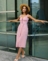 Платье-сарафан на лямках приталенного силуэта, отрезное по линии талии, с прямой юбкой на сборке. На юбке переда накладные карманы. На лифе переда вертикальные рельефы, верхний край лифа оформлен фигурной линией. Лиф спинки с вертикальными рельефами и средним швом. Застежка центральная на 7 обметанных петель и пуговиц.