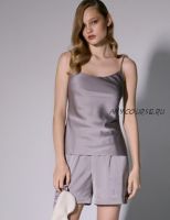 Топ малого объема, полуприлегающего силуэта, на бретелях, длиной до линии бедер. Перед и спинка раскроены по косой (долевая нить расположена под углом 45 градусов к линии центра детали). Вырез горловины переда и спинки оформлен глубокой плавной вогнутой линией. Срезы выреза и проймы, переда и спинки, обработаны обтачками.