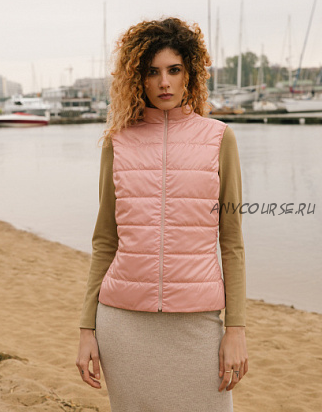 Выкройка жилета. Жилет 2-в-1, стеганый, полуприлегающего силуэта, малого объема, длиной выше линии бедер, на подкладке. Боковой шов отсутствует, введен отрезной бочок. Нагрудная вытачка размоделирована в пройму и частично вниз. Карманы на потайной молнии в рельефах переда. Спинка без среднего шва. Проймы по спинке и переду обработаны резинкой-жилкой.