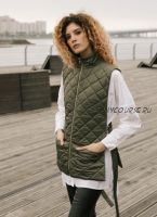 Выкройка жилета. Жилет без бочков стеганый, на подкладке, длиной выше линии бедер. Боковые части отсутствуют, по линии талии оформлены держатели с полукольцами на переде и пояс на спинке. Перед состоит из верхней и нижней части, нагрудная вытачка переведена в шов. В нижней части переда карманы. Спинка со средним швом. Горловина обработана воротником-стойкой. Застежка центральная спереди на молнию.