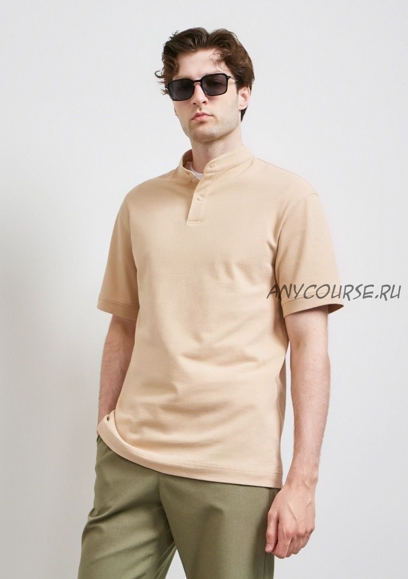 Футболка-поло прямого силуэта с воротником-стойкой. Застежка на две пуговицы. Рукав втачной со спущенным плечом. По низу рукава притачные манжеты шириной 2,5 см. Про пройме и шву притачивания манжет отделочная строчка шириной 5 мм. По стойке и планке - шириной 1 мм. Низ изделия обработан на плоскошовной машине.