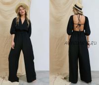 Свободный комбинезон отрезной по линии талии. Верхняя часть - блуза с втачным рукавом. По низу рукава сборка на эластичную ленту. По переду блузы запах. Горловина обработана обтачками. Спинка открытая, с завязками. По краю отрезного бочка спинки и части оката рукава притачана эластичная лента. Нижняя часть – свободные брюки с карманами в боковых швах. По талии притачной пояс с эластичной лентой.