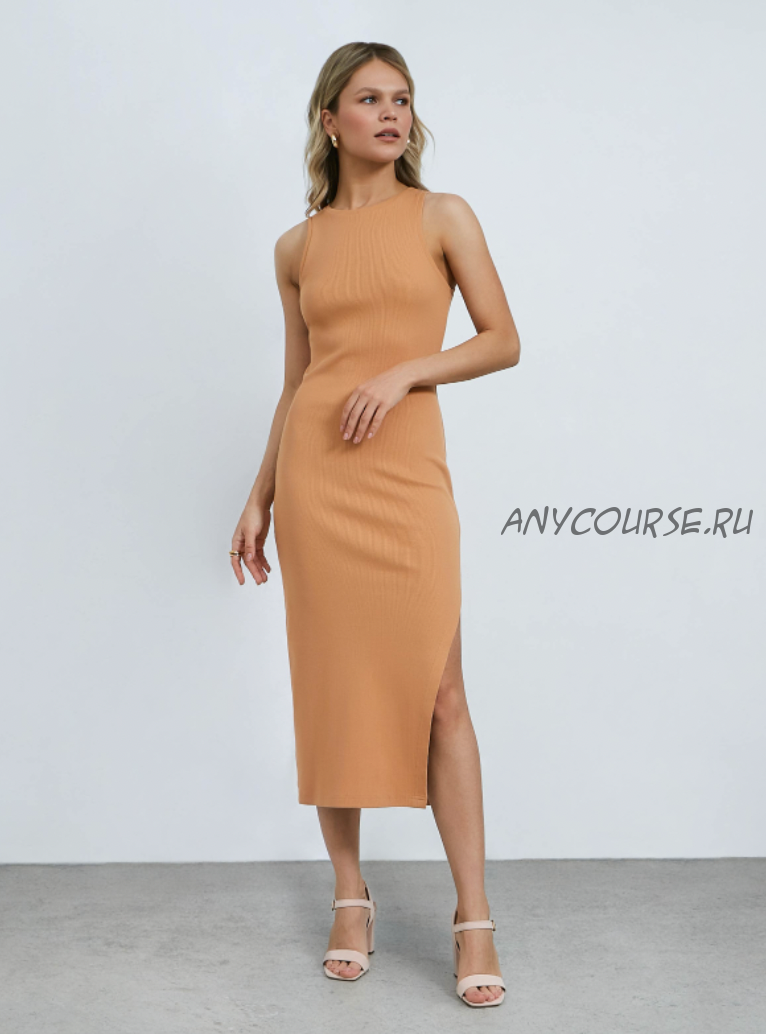 Трикотажное платье прилегающего силуэта с американской проймой. Пройма обработана узкой притачной бейкой. По левому боку фигурный разрез от середины бедра.
