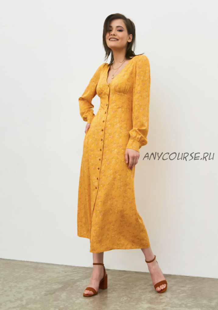 Платье прилегающего силуэта длиной до середины голени. По переду рельефные швы и фигурные подрезы. Лиф со сборкой, на подкладке. Верхняя часть спинки с рельефами и средним швом. Рукав втачной со сборкой в верхней части. По низу рукава сборка и разрез, окантованный бейкой. Манжеты застегиваются на одну петлю и пуговицу. Юбка расклешенная к низу. По задним половинкам юбки вытачки и средний шов. Застежка на пуговицы.
