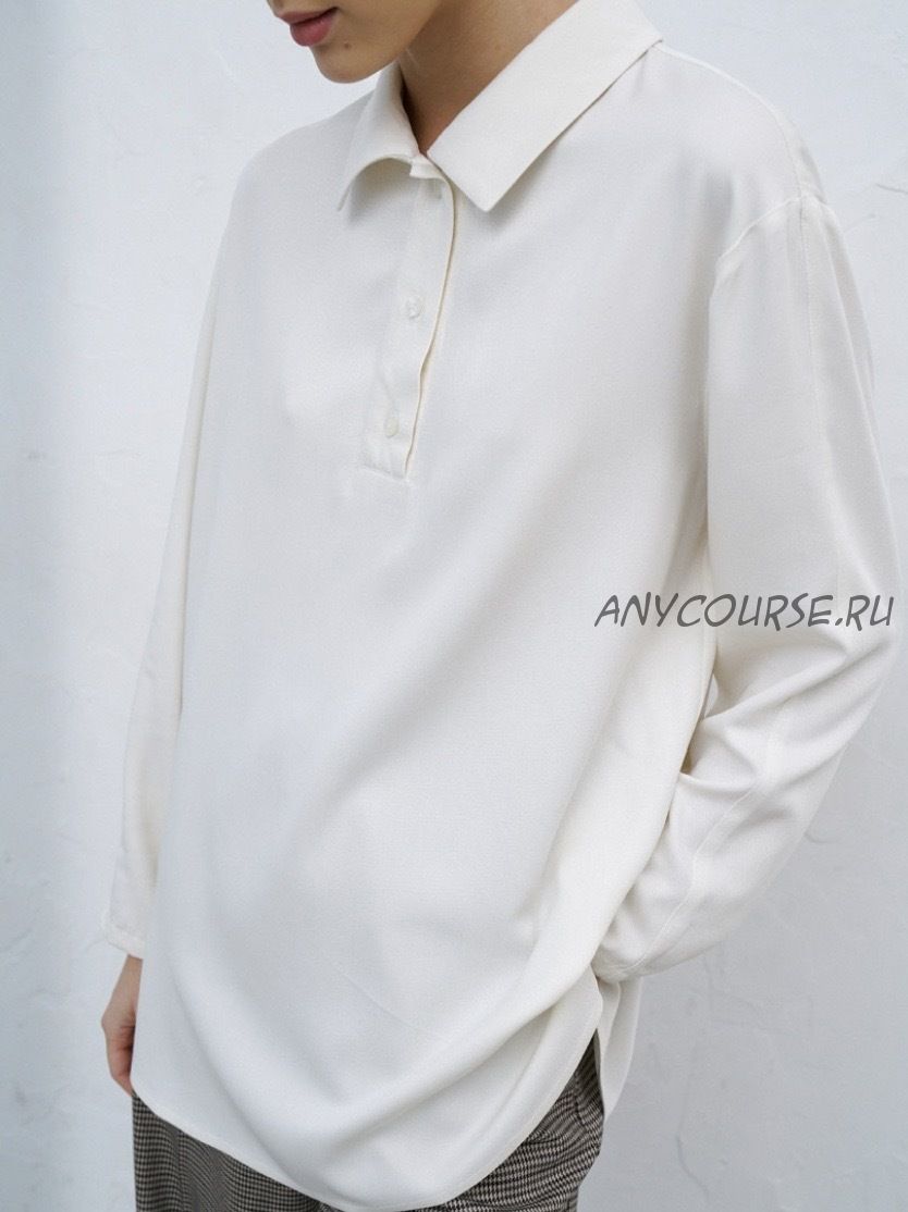 Рубашка прямого силуэта большого объема. Рукав втачной двухшовный. По плечевому шву и верхнему шву рукава отстрочка на 0,1 см. По переду расположена притачная планка с застежкой на 3 петли и пуговицы. Воротник стояче-отложной, линия низа спинки ниже линии низа переда на 4 см. Низ изделия и рукавов обработаны швом в подгибку с закрытым срезом.