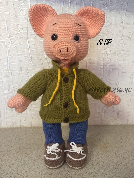 Мастер класс в PDF формате на 21 стр. содержит 47 фотографий и подробное описание процесса вязания крючком Хрюши, а так же вязание спицами свитер.